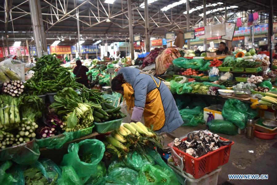 A vendor arranges vegetables at Yaowangshan Farm Product Market in Lhasa, capital of southwest China's Tibet Autonomous Region, Dec. 29, 2019. Through the cultivation of modern agriculture, vegetables are no more rarities on the "roof of the world," making today's Tibetan tables more delicious, nutritious. (Xinhua/Zhou Jinshuai)