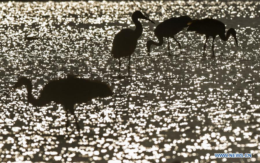 White cranes are seen in the wetland of the Wuxing white crane conservation area by the Poyang Lake in Nanchang, east China's Jiangxi Province, Dec. 21, 2020. Numerous migratory birds including white cranes and swans have arrived in the wetland by the Poyang Lake, taking it as their winter habitat. (Xinhua/Wan Xiang)