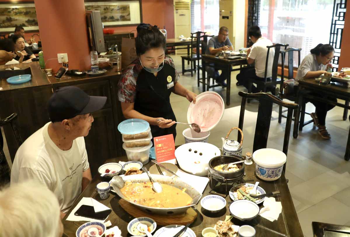 A waitress packs leftovers for customers who finished a meal at noon on Aug 13, 2020 at Yongmama restaurant in Lubei district, Tangshan, North China's Hebei province. (Photo by Zou Hong/China Daily)