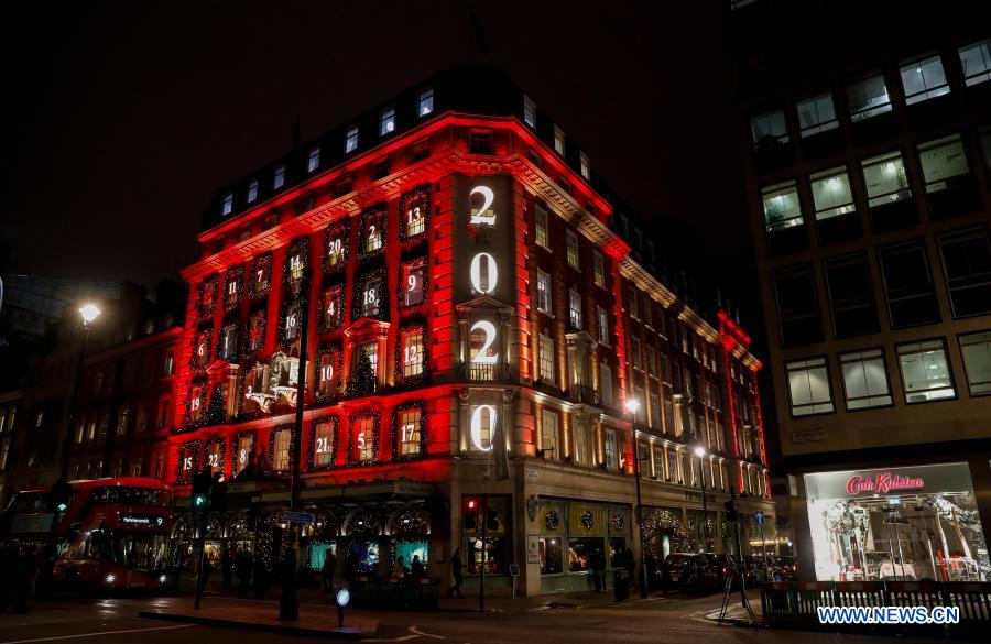The facade of the Fortnum and Mason food store is seen decorated in the style of an Advent calendar in London, Britain, Dec. 22, 2020. (Xinhua/Han Yan)