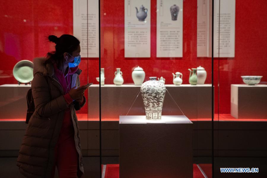 A visitor watches items on display at the "1420: Nanjing to Beijing" cultural relics exhibition marking the 600th anniversary of moving capital of the Ming Dynasty (1368-1644) in Nanjing, east China''s Jiangsu Province, Dec. 22, 2020. Orchestrated by the Nanjing Museum Administration, and featuring 340 pieces (sets) of selected cultural relics, the exhibition tells a story of how the Ming Dynasty moved its capital from Nanjing to Beijing exactly 600 years ago, and unveils the unique historical cultures in the two cities. (Photo by Su Yang/Xinhua) |