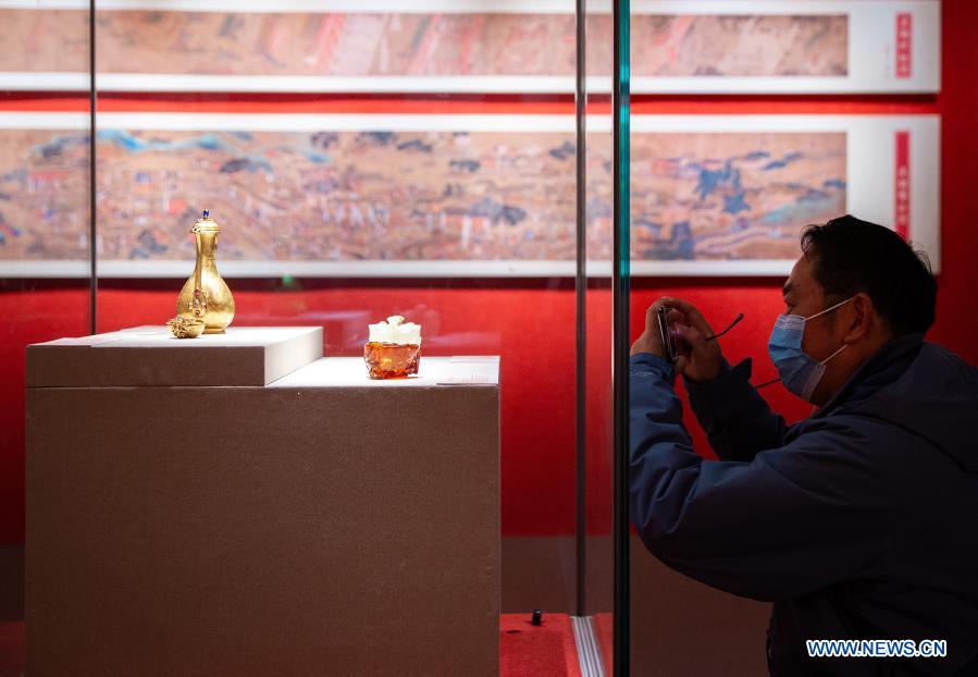 A visitor takes picture of items on display at the "1420: Nanjing to Beijing" cultural relics exhibition marking the 600th anniversary of moving capital of the Ming Dynasty (1368-1644) in Nanjing, east China''s Jiangsu Province, Dec. 22, 2020. Orchestrated by the Nanjing Museum Administration, and featuring 340 pieces (sets) of selected cultural relics, the exhibition tells a story of how the Ming Dynasty moved its capital from Nanjing to Beijing exactly 600 years ago, and unveils the unique historical cultures in the two cities. (Photo by Su Yang/Xinhua)