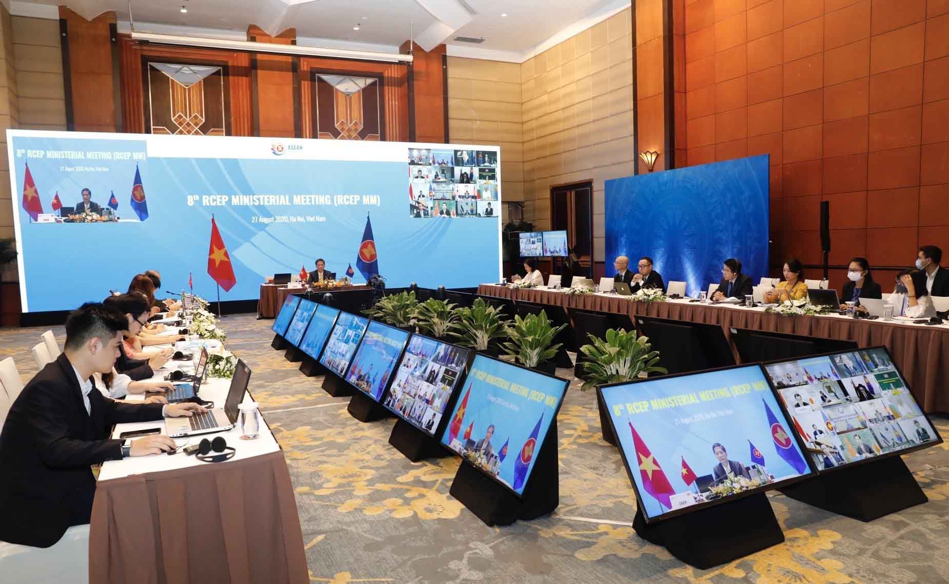 People attend the eighth Regional Comprehensive Economic Partnership (RCEP) Ministerial Meeting via video conference in Hanoi, Vietnam on Aug. 27, 2020. (VNA via Xinhua)