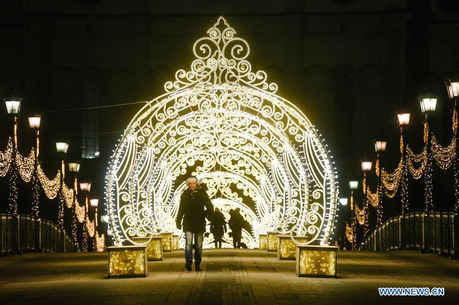 People walk under light decorations for the New Year in Moscow, Russia, on Dec. 23, 2020. (Xinhua/Evgeny Sinitsyn)