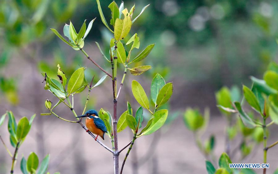 A kingfisher perches on a mangrove tree at Sanjiang mangrove wetland park in Haikou, south China's Hainan Province, on Dec. 23, 2020. The Dongzhaigang wetland ecological rehabilitation project was accomplished recently, according to the Dongzhaigang National Nature Reserve Authority in Haikou. Kicked off on March 18, 2019, the project aimed to effectively rehabilitate the ecological systems including mangrove forests along the seashore of Dongzhaigang so that migrant birds in the country may find better habitats in winter time. (Xinhua/Yang Guanyu)