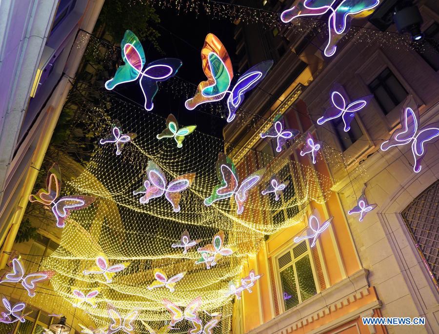 Photo shows a light show on a street in Hong Kong, south China, Dec. 20, 2020. (Xinhua/Li Gang)