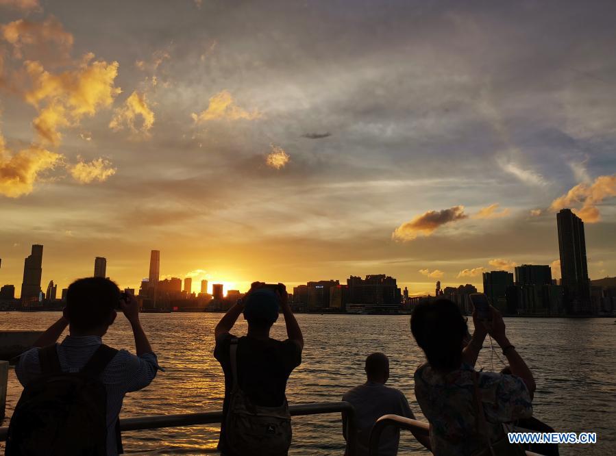 In this photo taken by a phone, people take photos of sunset view in Hong Kong, south China, July 15, 2020. (Xinhua/Li Gang)