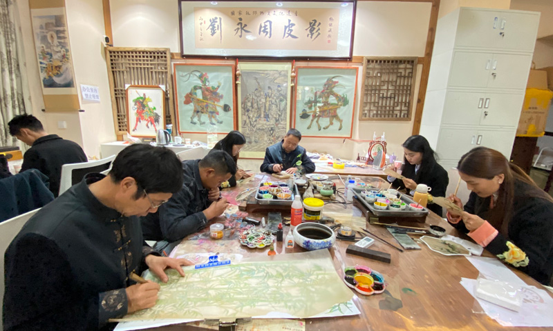 Inside a studio of a shadow puppetry theater, artists are carving, painting and coloring the puppets. (People's Daily Online/Meng Bin)