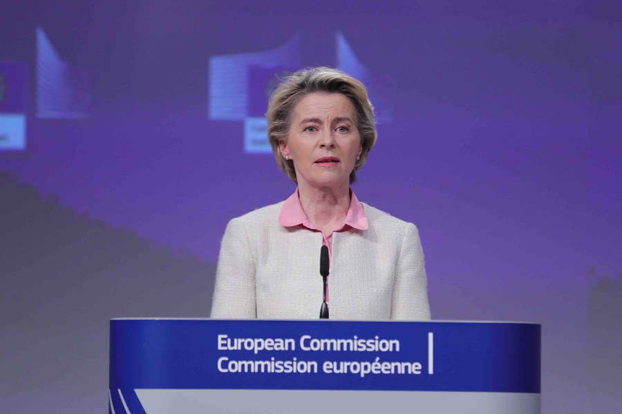 European Commission President Ursula von der Leyen attends a press conference on the post-Brexit trade talks in Brussels, Belgium, Dec. 24, 2020. (Xinhua/Zheng Huansong)