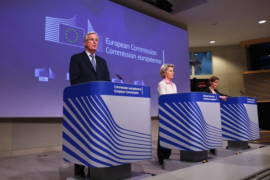 European Commission President Ursula von der Leyen (C) and EU's chief Brexit negotiator Michel Barnier (L) attend a press conference on the post-Brexit trade talks in Brussels, Belgium, Dec. 24, 2020. (Xinhua/Zheng Huansong)