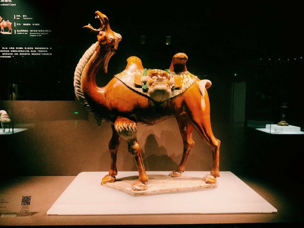 The tri-color glazed pottery camel was excavated from the tomb of An Pu, a general of the Tang dynasty. According to historical records, An was a Sogdian general who served in the Chinese army for his whole life. The tri-color glazed pottery camel, an animal not originating from China, represented An’s foreign identity, as well as a solid evidence of ancient China’s cultural and people-to-people exchange with the world.