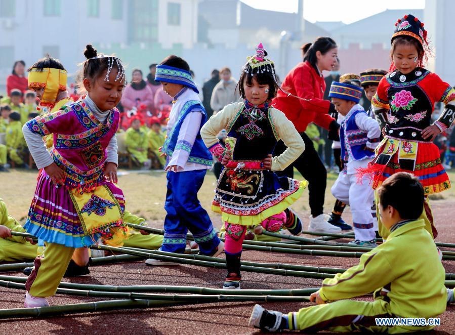 Children take part in a bamboo dance at Hongqiao central kindergarten in Changxing County of Huzhou City, east China's Zhejiang Province, Dec. 25, 2020. The kindergarten held various traditional folk activities to celebrate the upcoming New Year. (Xinhua/Xu Yu)