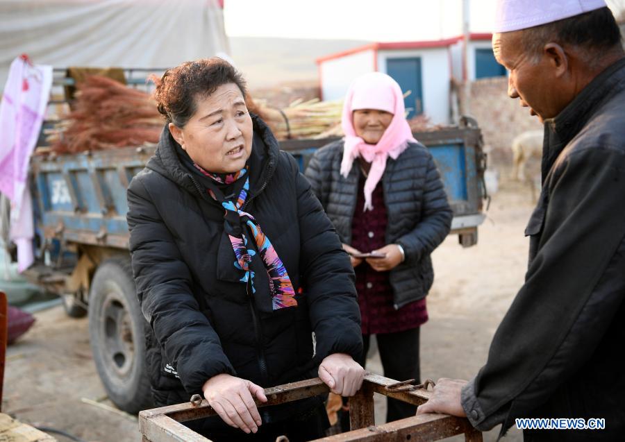 Ding Haiyan visits villagers to learn about their recent condition in Hejiayuan Village of Xihaigu in northwest China''s Ningxia Hui Autonomous Region, Oct. 28, 2020. Xihaigu, a largely mountainous region in northwest Ningxia, was once inflicted by deep poverty and labeled the "most unfit place for human settlement" by the United Nations in the 1970s due to land reclamation, drought, and a fragile ecological environment. On Nov. 16, 2020, Xihaigu historically bid farewell to absolute poverty, during which "she power" played an indispensable role. Ding Haiyan, 55, is chairwoman of the trade union of water supplies bureau of Wuzhong City in Ningxia. She transferred to Hejiayuan Village in Yuwang Township of draught-haunted county of Tongxin in central Ningxia in 2015 starting her new career as a poverty alleviation cadre. To Ding''s great disappointment, most villagers there were seniors or the disabled who had no access to paved roads and electric power for industrial purposes, and little confidence in her will and power. Despite these, Ding insisted on making door-to-door visits to get her head around the basic situation there. She came up with a two-pillar strategy to simultaneously improve villagers'' income and infrastructure in the village. She also tailored individual poverty-alleviation plans for each household in the village. Started with livestock breeding, villagers had more and more confidence in Ding as they saw steadily increasing income. Ding also managed to multiply the villagers'' sources of income by encouraging production of specialty grains like millet and buckwheat. Thanks to her efforts, a paved road was also accomplished to bring output of the village to wider markets. Looking at an almost ready canteen for senior citizens, the last one of her promises to the villagers in Hejiayuan, Ding admitted that she occasionally shed tears due to the difficulties she had to confront, but she would never forget the villagers'' eyes with expectation and her responsibility for them. (Xinhua/Yang Zhisen)