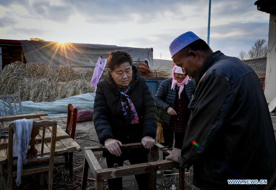 Ding Haiyan visits a villager''s home in Hejiayuan Village of Xihaigu in northwest China''s Ningxia Hui Autonomous Region, Oct. 28, 2020. Xihaigu, a largely mountainous region in northwest Ningxia, was once inflicted by deep poverty and labeled the "most unfit place for human settlement" by the United Nations in the 1970s due to land reclamation, drought, and a fragile ecological environment. On Nov. 16, 2020, Xihaigu historically bid farewell to absolute poverty, during which "she power" played an indispensable role. Ding Haiyan, 55, is chairwoman of the trade union of water supplies bureau of Wuzhong City in Ningxia. She transferred to Hejiayuan Village in Yuwang Township of draught-haunted county of Tongxin in central Ningxia in 2015 starting her new career as a poverty alleviation cadre. To Ding''s great disappointment, most villagers there were seniors or the disabled who had no access to paved roads and electric power for industrial purposes, and little confidence in her will and power. Despite these, Ding insisted on making door-to-door visits to get her head around the basic situation there. She came up with a two-pillar strategy to simultaneously improve villagers'' income and infrastructure in the village. She also tailored individual poverty-alleviation plans for each household in the village. Started with livestock breeding, villagers had more and more confidence in Ding as they saw steadily increasing income. Ding also managed to multiply the villagers'' sources of income by encouraging production of specialty grains like millet and buckwheat. Thanks to her efforts, a paved road was also accomplished to bring output of the village to wider markets. Looking at an almost ready canteen for senior citizens, the last one of her promises to the villagers in Hejiayuan, Ding admitted that she occasionally shed tears due to the difficulties she had to confront, but she would never forget the villagers'' eyes with expectation and her responsibility for them. (Xinhua/Feng Kaihua)