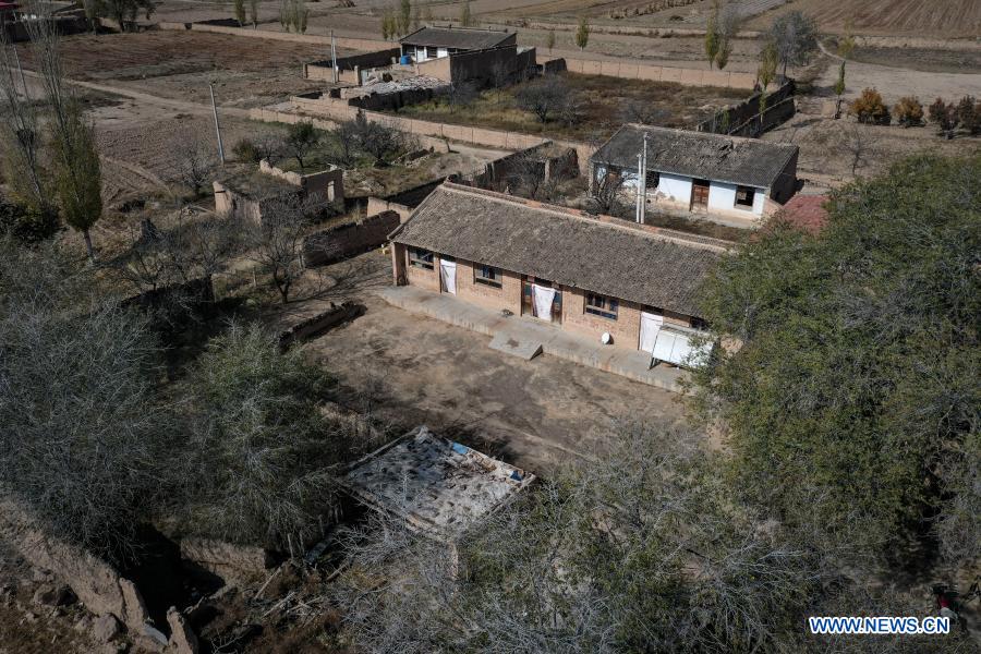 Aerial photo taken on Oct. 28, 2020 shows the old buildings at Hejiayuan Village of Xihaigu in northwest China''s Ningxia Hui Autonomous Region. Xihaigu, a largely mountainous region in northwest Ningxia, was once inflicted by deep poverty and labeled the "most unfit place for human settlement" by the United Nations in the 1970s due to land reclamation, drought, and a fragile ecological environment. On Nov. 16, 2020, Xihaigu historically bid farewell to absolute poverty, during which "she power" played an indispensable role. Ding Haiyan, 55, is chairwoman of the trade union of water supplies bureau of Wuzhong City in Ningxia. She transferred to Hejiayuan Village in Yuwang Township of draught-haunted county of Tongxin in central Ningxia in 2015 starting her new career as a poverty alleviation cadre. To Ding''s great disappointment, most villagers there were seniors or the disabled who had no access to paved roads and electric power for industrial purposes, and little confidence in her will and power. Despite these, Ding insisted on making door-to-door visits to get her head around the basic situation there. She came up with a two-pillar strategy to simultaneously improve villagers'' income and infrastructure in the village. She also tailored individual poverty-alleviation plans for each household in the village. Started with livestock breeding, villagers had more and more confidence in Ding as they saw steadily increasing income. Ding also managed to multiply the villagers'' sources of income by encouraging production of specialty grains like millet and buckwheat. Thanks to her efforts, a paved road was also accomplished to bring output of the village to wider markets. Looking at an almost ready canteen for senior citizens, the last one of her promises to the villagers in Hejiayuan, Ding admitted that she occasionally shed tears due to the difficulties she had to confront, but she would never forget the villagers'' eyes with expectation and her responsibility for them. (Xinhua/Feng Kaihua)