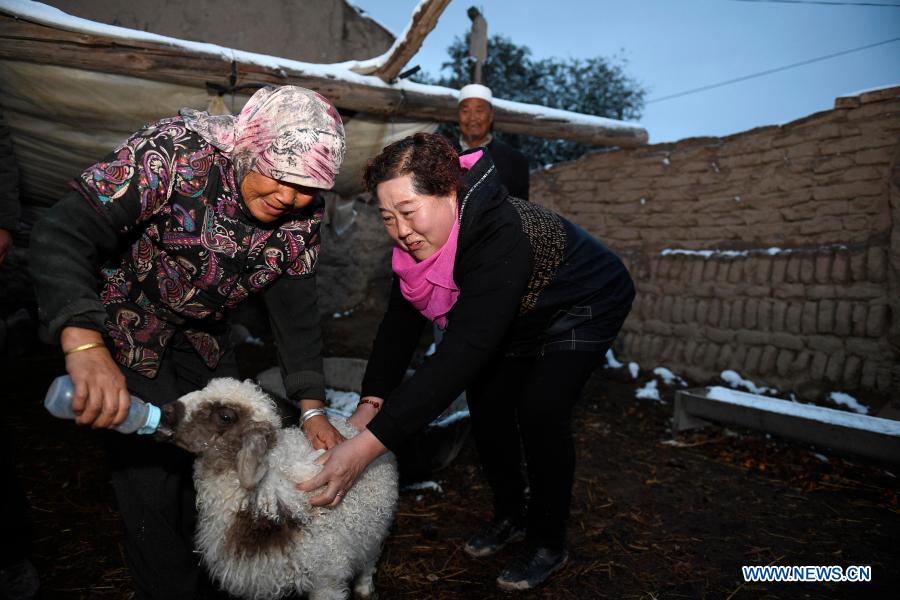 Ding Haiyan (R) visits villagers to learn about their livestock breeding in Hejiayuan Village of Xihaigu in northwest China''s Ningxia Hui Autonomous Region, Oct. 27, 2016. Xihaigu, a largely mountainous region in northwest Ningxia, was once inflicted by deep poverty and labeled the "most unfit place for human settlement" by the United Nations in the 1970s due to land reclamation, drought, and a fragile ecological environment. On Nov. 16, 2020, Xihaigu historically bid farewell to absolute poverty, during which "she power" played an indispensable role. Ding Haiyan, 55, is chairwoman of the trade union of water supplies bureau of Wuzhong City in Ningxia. She transferred to Hejiayuan Village in Yuwang Township of draught-haunted county of Tongxin in central Ningxia in 2015 starting her new career as a poverty alleviation cadre. To Ding''s great disappointment, most villagers there were seniors or the disabled who had no access to paved roads and electric power for industrial purposes, and little confidence in her will and power. Despite these, Ding insisted on making door-to-door visits to get her head around the basic situation there. She came up with a two-pillar strategy to simultaneously improve villagers'' income and infrastructure in the village. She also tailored individual poverty-alleviation plans for each household in the village. Started with livestock breeding, villagers had more and more confidence in Ding as they saw steadily increasing income. Ding also managed to multiply the villagers'' sources of income by encouraging production of specialty grains like millet and buckwheat. Thanks to her efforts, a paved road was also accomplished to bring output of the village to wider markets. Looking at an almost ready canteen for senior citizens, the last one of her promises to the villagers in Hejiayuan, Ding admitted that she occasionally shed tears due to the difficulties she had to confront, but she would never forget the villagers'' eyes with expectation and her responsibility for them. (Xinhua/Wang Peng)