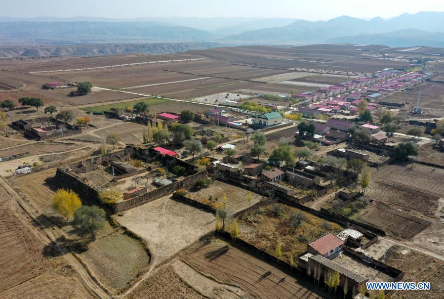 Aerial photo taken on Oct. 28, 2020 shows the old buildings (front) and the new ones (rear) at Hejiayuan Village of Xihaigu in northwest China''s Ningxia Hui Autonomous Region. Xihaigu, a largely mountainous region in northwest Ningxia, was once inflicted by deep poverty and labeled the "most unfit place for human settlement" by the United Nations in the 1970s due to land reclamation, drought, and a fragile ecological environment. On Nov. 16, 2020, Xihaigu historically bid farewell to absolute poverty, during which "she power" played an indispensable role. Ding Haiyan, 55, is chairwoman of the trade union of water supplies bureau of Wuzhong City in Ningxia. She transferred to Hejiayuan Village in Yuwang Township of draught-haunted county of Tongxin in central Ningxia in 2015 starting her new career as a poverty alleviation cadre. To Ding''s great disappointment, most villagers there were seniors or the disabled who had no access to paved roads and electric power for industrial purposes, and little confidence in her will and power. Despite these, Ding insisted on making door-to-door visits to get her head around the basic situation there. She came up with a two-pillar strategy to simultaneously improve villagers'' income and infrastructure in the village. She also tailored individual poverty-alleviation plans for each household in the village. Started with livestock breeding, villagers had more and more confidence in Ding as they saw steadily increasing income. Ding also managed to multiply the villagers'' sources of income by encouraging production of specialty grains like millet and buckwheat. Thanks to her efforts, a paved road was also accomplished to bring output of the village to wider markets. Looking at an almost ready canteen for senior citizens, the last one of her promises to the villagers in Hejiayuan, Ding admitted that she occasionally shed tears due to the difficulties she had to confront, but she would never forget the villagers'' eyes with expectation and her responsibility for them. (Xinhua/Feng Kaihua)