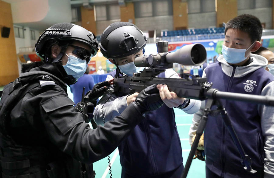 SWAT agents introduce their tactical gears to students during an event to raise anti-terror awareness in Beijing National Day School, Dec 27, 2020. (Photo by Zou Hong/chinadaily.com.cn)