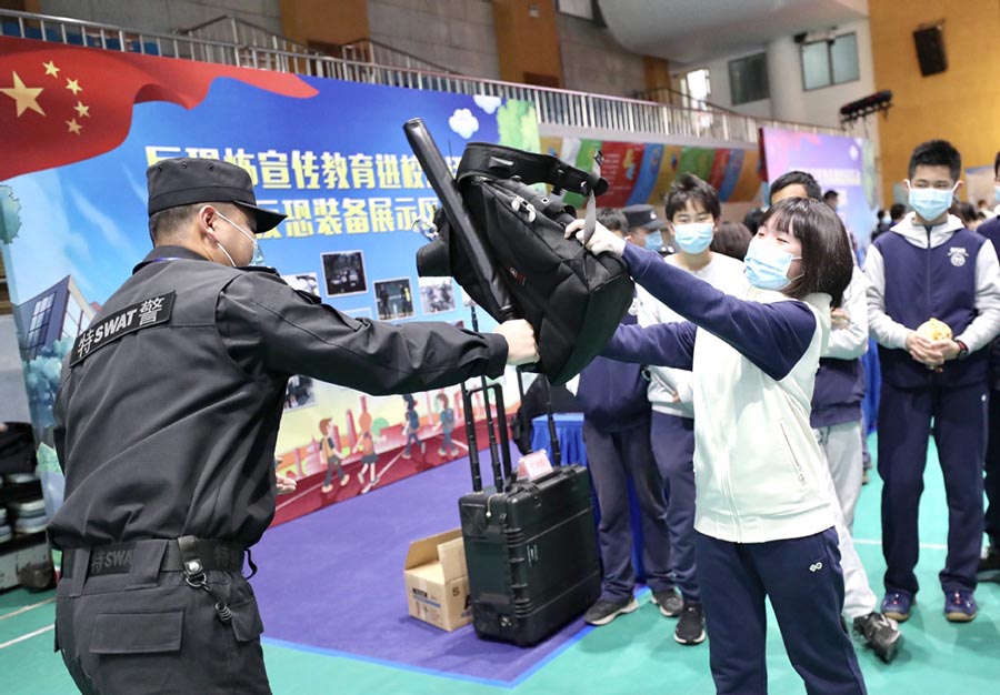A SWAT agent instructs a student how to react to an attack during an event to raise anti-terror awareness in Beijing National Day School, Dec 27, 2020. (Photo by Zou Hong/chinadaily.com.cn)