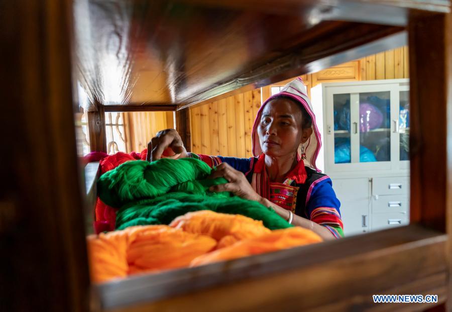 He Guiying sorts out thread at the handicraft cooperative in Xinsitu Village of Jinuo ethnic group in Jinghong City of Xishuangbanna Dai Autonomous Prefecture, southwest China's Yunnan Province, Dec. 25, 2020. In Xinsitu Village of Jinuo ethnic group, a handicraft cooperative has been set up by local women in an effort to inherit the weaving and embroidery skills of Jinuo ethnic group and help villagers increase income at the same time. He Guiying, 52, is the head of this handicraft cooperative and also the inheritor of the national-level intangible cultural heritage Jinuo drum dance. Under her lead, new programs of Jinuo drum dances are created and villagers are organized to go out for performances. They even take their traditional dances to campus so as to introduce the ethnic culture to more young people. In He Guiying's eyes, their costumes, as well as songs and dances, are important carriers of the ethnic culture. "The establishment of the cooperative is not only to protect the Jinuo traditional costumes, but more importantly to pass on the ancient skills," He Guiying said, hoping that more people will understand the Jinuo culture. (Xinhua/Chen Xinbo)