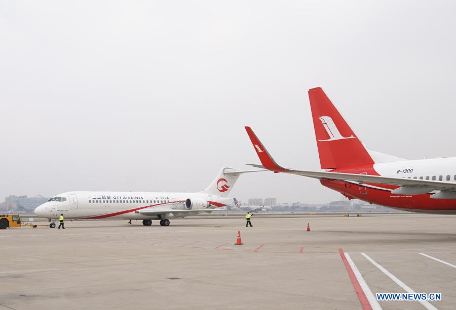 An ARJ21 jetliner of One Two Three Airlines (OTT Airlines) heads for designated area before performing its first flight at Shanghai Hongqiao International Airport in Shanghai, east China, Dec. 28, 2020. The ARJ21 is China's first turbo-fan regional passenger jetliner manufactured by the Commercial Aircraft Corporation of China (COMAC). OTT Airlines, a subsidiary of China Eastern Airlines, is the last among seven airlines to officially operate ARJ21 jetliner in China. (Xinhua/Ding Ting)