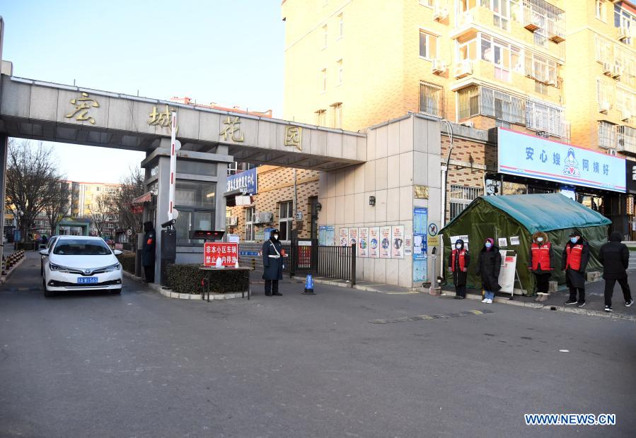 Community workers are seen on duty at the entrance of the Hongcheng Huayuan residential compound on Wangquan Street, Shunyi District, Beijing, capital of China, on Dec. 29, 2020. Beijing reported seven new locally-transmitted confirmed COVID-19 cases on Monday, according to the Beijing municipal health commission. The seven patients, who live in the Shunyi District, are all close contacts of earlier reported cases. (Xinhua/Ren Chao)