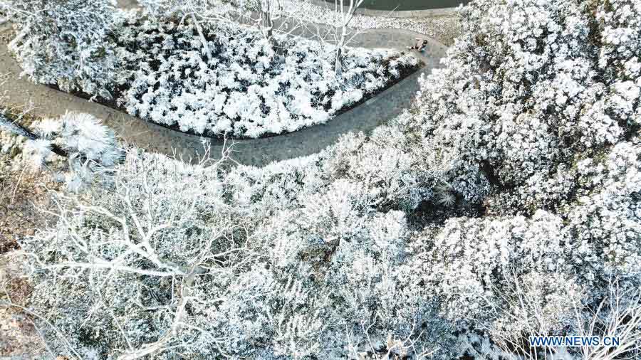 Aerial photo taken on Dec. 30, 2020 shows a man jogging at Huancheng Park in Hefei, capital of east China's Anhui Province. (Xinhua/Zhang Duan)
