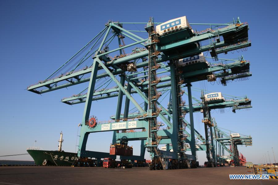 A freight ship loads cargos at Huanghua Port in Cangzhou City, north China's Hebei Province, Dec. 30, 2020. By Dec. 29, 2020, the annual throughput of Huanghua Port has reached over 300 million tons, with a year-on-year increase of 5.17 percent. (Photo by Yuan Liwei/Xinhua)
