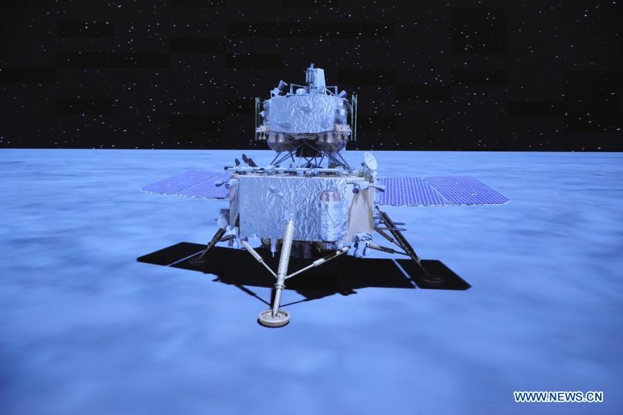 This image taken from video animation at Beijing Aerospace Control Center (BACC) on Dec. 2, 2020 shows Chang'e-5 spacecraft landing on the moon. China's Chang'e-5 spacecraft successfully landed on the near side of the moon and sent back images, the China National Space Administration (CNSA) announced. (Xinhua/Jin Liwang)