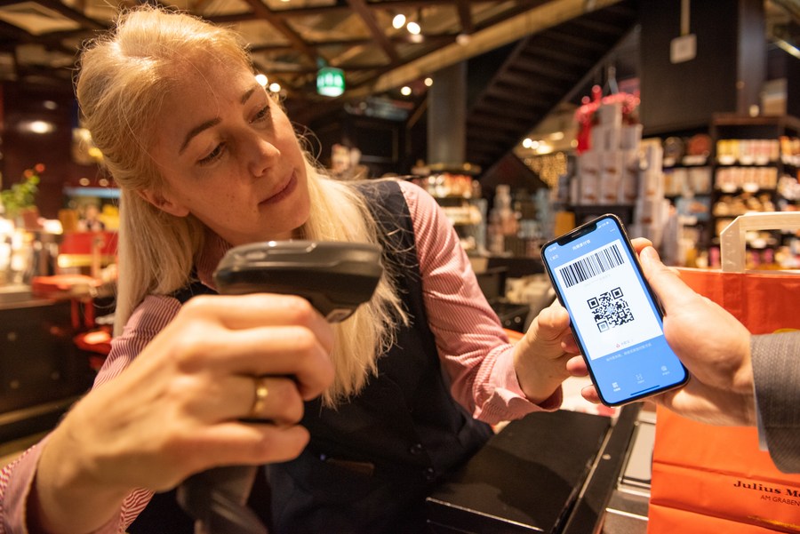 A staff member scans a QR code from a customer's Alipay app at Julius Meinl, a coffee shop in Vienna, Austria, on Jan. 9, 2020. (Xinhua/Guo Chen)