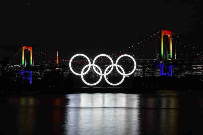 The illuminated Olympic rings, Rainbow Bridge and Tokyo Tower are seen in the Tokyo Bay area on Dec. 1, 2020. (Xinhua/Du Xiaoyi)