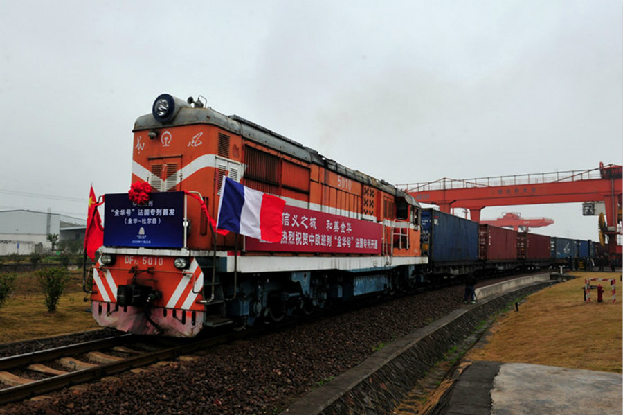 Train X8020/19 departs Jinhua, east China's Zhejiang province, for Dourges, France on Nov. 26, carrying 82 TEUs (twenty-foot equivalent units) of cargos. (Photo by Shi Bufa/People's Daily Online)