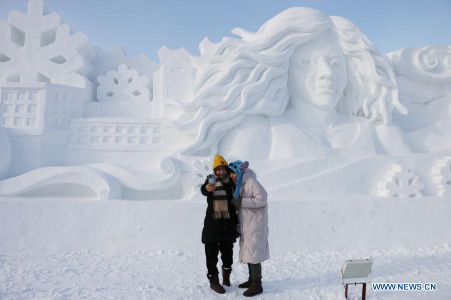 Tourists take selfies in front of a snow sculpture in Datan Town, Fengning Manchu Autonomous County, north China's Hebei Province, Jan. 1, 2021. (Photo by Liu Huanyu/Xinhua)