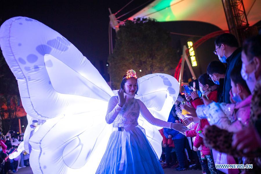 A performer interacts with tourists at the Happy Valley Wuhan theme park in Wuhan, central China's Hubei Province, Jan. 1, 2021. People came to have fun and enjoy the view at the Happy Valley in Wuhan to greet the New Year on Friday. (Xinhua/Xiong Qi)