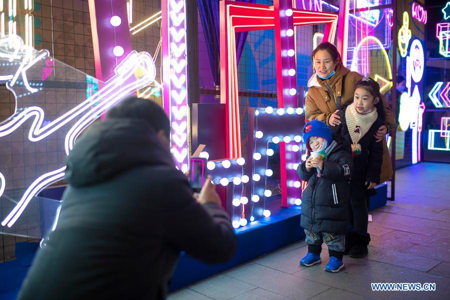 Tourists pose for a photo at the Happy Valley Wuhan theme park in Wuhan, central China's Hubei Province, Jan. 1, 2021. People came to have fun and enjoy the view at the Happy Valley in Wuhan to greet the New Year on Friday. (Xinhua/Xiong Qi)