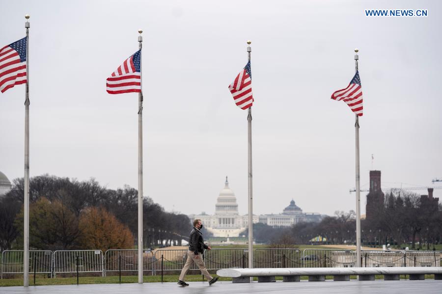 A man wearing a face mask walks on the National Mall in Washington, D.C., the United States, on Jan. 1, 2021. The total number of COVID-19 cases in the United States topped 20 million on Friday, according to the Center for Systems Science and Engineering (CSSE) at Johns Hopkins University. (Xinhua/Liu Jie)