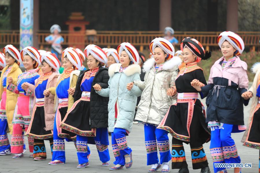People rehearse a dance to greet the advent of the New Year in Ameiqituo Town of Qinglong County, Qianxinan Buyi-Miao Autonomous Prefecture of southwest China's Guizhou Province, Dec. 31, 2020. (Xinhua/Liu Qinbing)