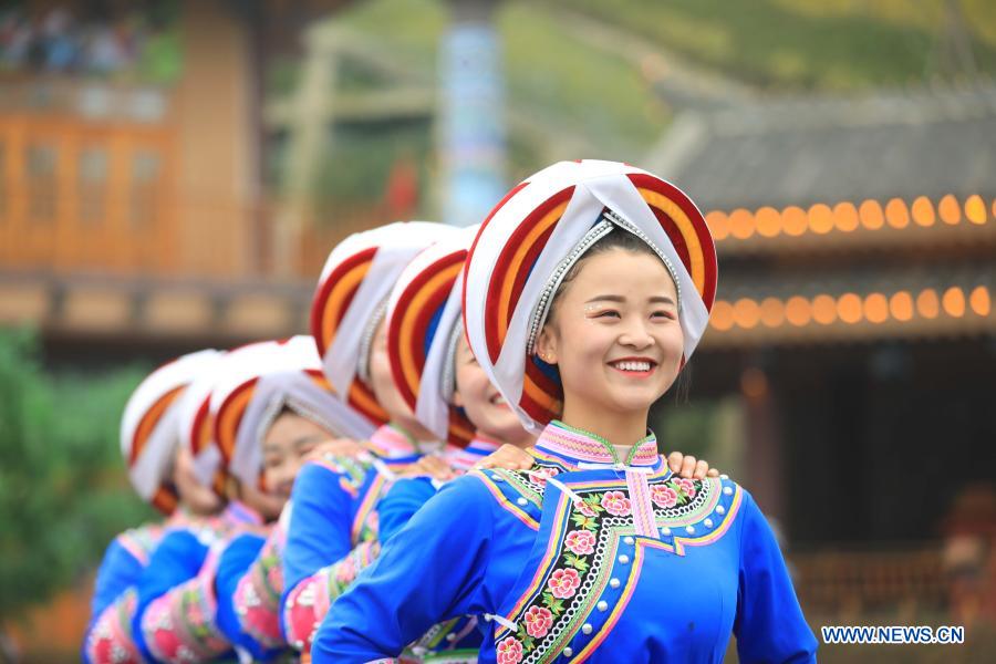 People rehearse a dance to greet the advent of the New Year in Ameiqituo Town of Qinglong County, Qianxinan Buyi-Miao Autonomous Prefecture of southwest China's Guizhou Province, Dec. 31, 2020. (Xinhua/Liu Qinbing)