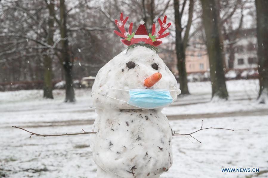 A snowman with a face mask is seen at a snow-covered park in Berlin, capital of Germany, Jan. 3, 2021. The first snow of this year in Berlin fell on Sunday. (Xinhua/Shan Yuqi)