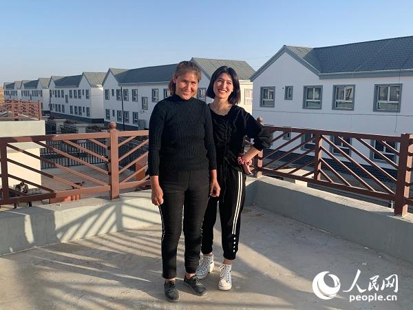 Kuwahan Mettursun and her daughter pose for photos in front of their new home. (People’s Daily Online/Yang Rui)