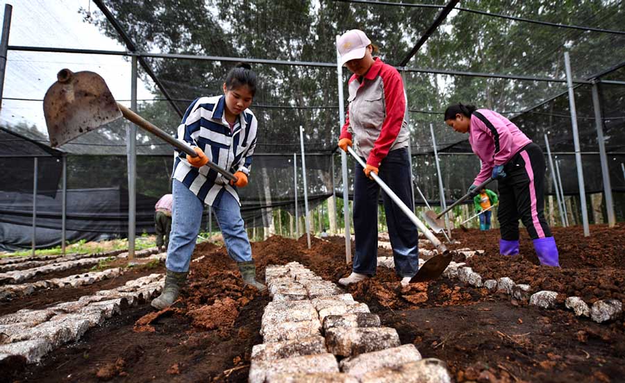 Gaofeng residents work at the village's edible fungus plantation in Baisha Li autonomous county, Hainan province. (Photo/Xinhua)