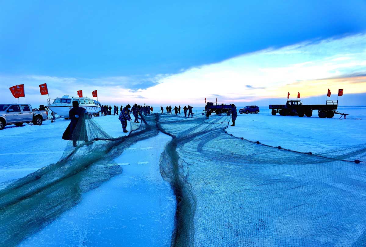 Residents from Chifeng's Hexigten Banner use traditional fishing methods on Jan 1, 2021, in Inner Mongolia autonomous region. (Photo by Meng Zhigang/For chinadaily.com.cn)