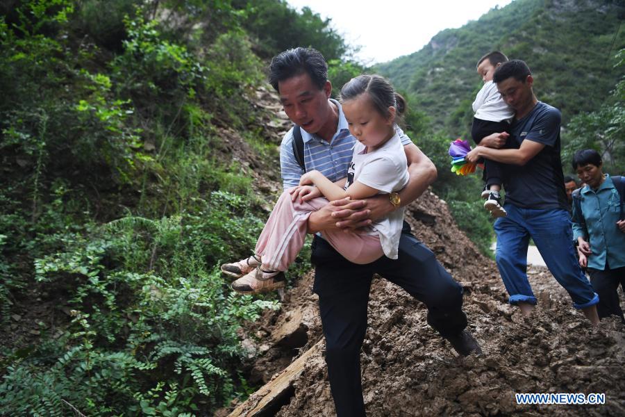 People send children to school after roads were damaged by flooding and landslide in Heping Village of Luotang Town in Longnan City, northwest China's Gansu Province, on Aug. 22, 2020. Local government has organized rescuers to repair damaged roads in order to ensure that children can go to school safely. Village officials and parents joined in a voluntary service team to protect children on their way to school. (Xinhua/Chen Bin)