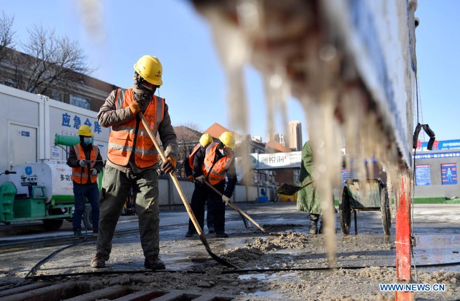 Workers work at a construction site of Tianjin Subway Line 11 in north China's Tianjin, Jan. 6, 2021. Many workers stick to their posts outdoors as the city experiences a strong cold wave that started on Wednesday. (Photo by Li Ran/Xinhua)