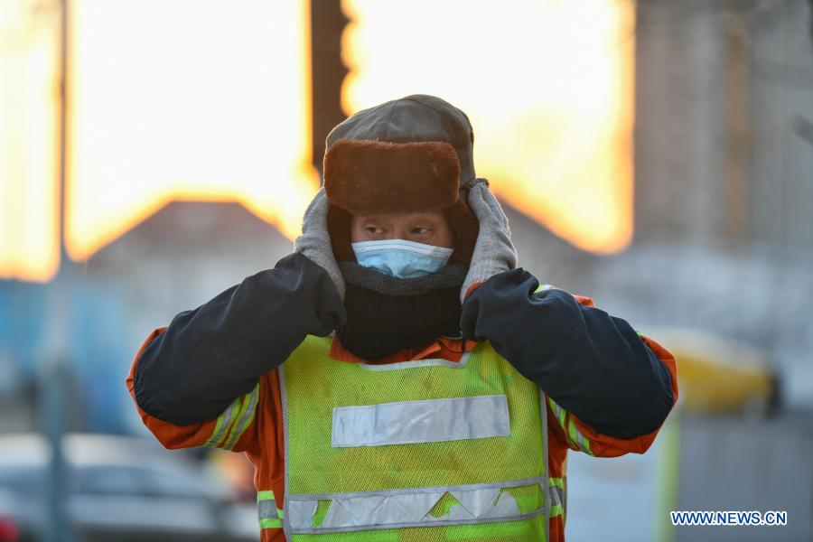 A sanitation worker adjusts his hat at Nankai District in north China's Tianjin, Jan. 6, 2021. Many workers stick to their posts outdoors as the city experiences a strong cold wave that started on Wednesday. (Photo by Sun Fanyue/Xinhua)