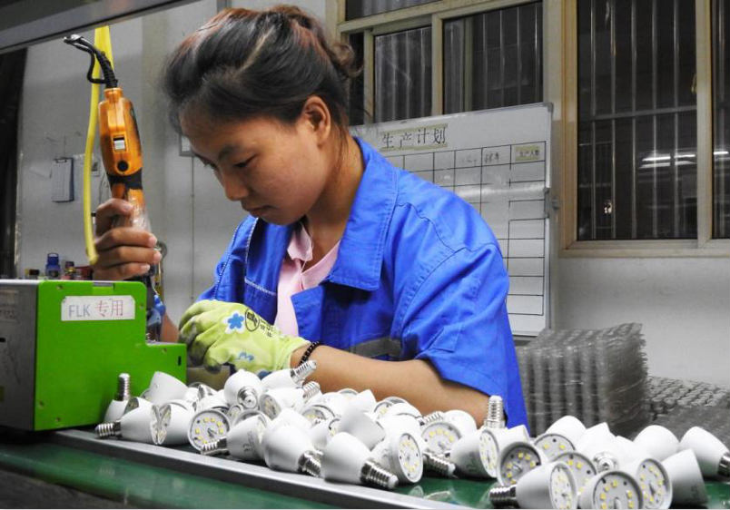 A worker inspects energy-efficient LED lamps in an industrial park in Lianyungang, east China's Jiangsu province, June 29, 2020. (Photo by Geng Yuhe/People's Daily Online)