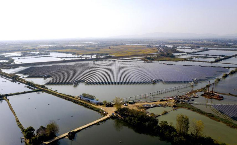 Photo taken on Nov. 7, 2020 shows a photovoltaic project on the Tuxiao Lake, Changde, central China's Hunan province. (Photo by Jiang Shiyuan/People's Daily Online)
