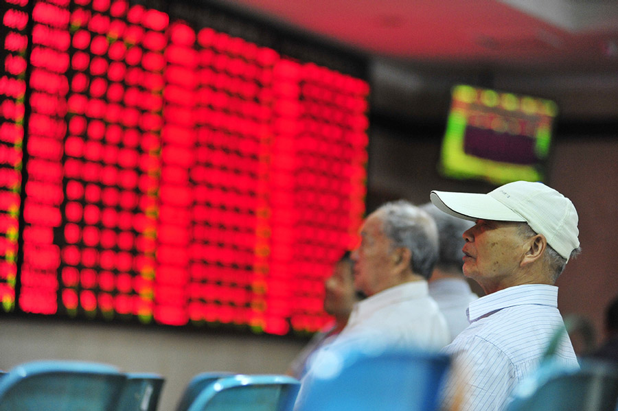 Investors check share prices at a securities firm in Nanjing, Jiangsu province. (Photo by Xing Qu/For China Daily)