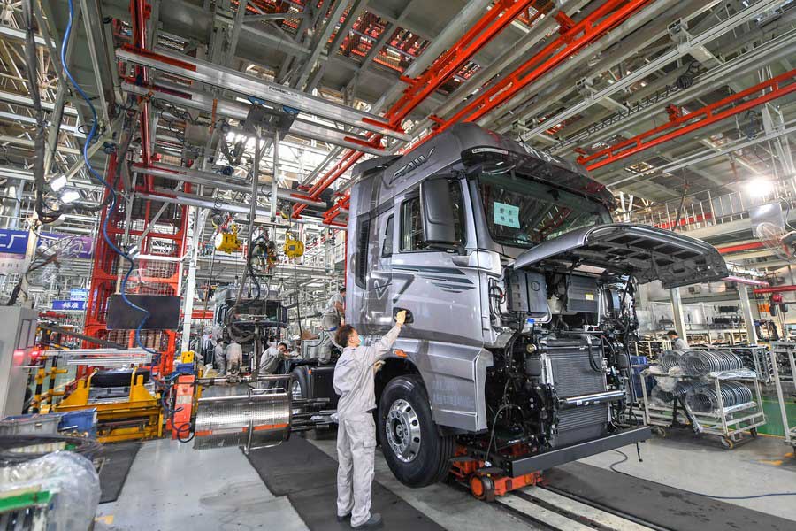 Workers assemble vehicles at the general assembly line of FAW Jiefang, a truck-manufacturing subsidiary of First Automotive Works (FAW) Group Co. Ltd., in Changchun, northeast China's Jilin Province, Sept. 23, 2020. (Xinhua/Zhang Nan)