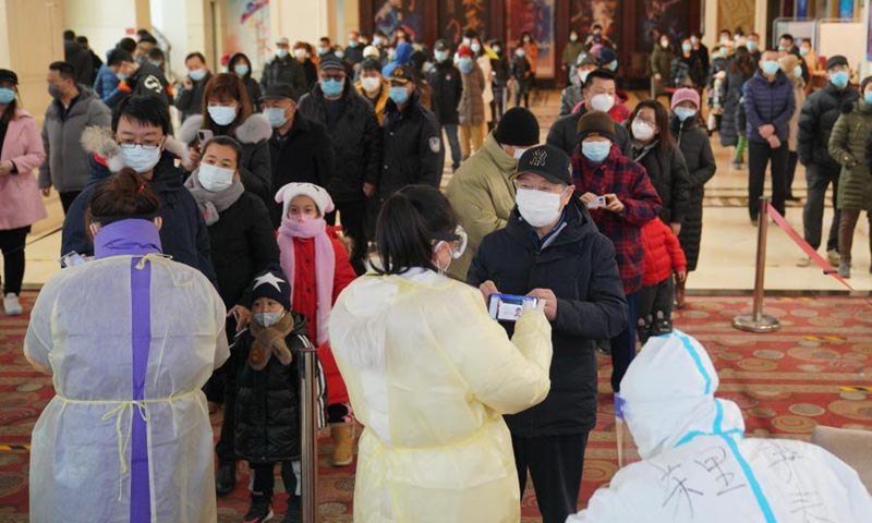 Residents register their personal information before the COVID-19 test at a community COVID-19 testing site in Qiaoxi District of Shijiazhuang, capital of north China's Hebei Province, Jan. 12, 2021. Shijiazhuang started the second round of nucleic acid tests for all residents on Tuesday. (Xinhua/Mu Yu)